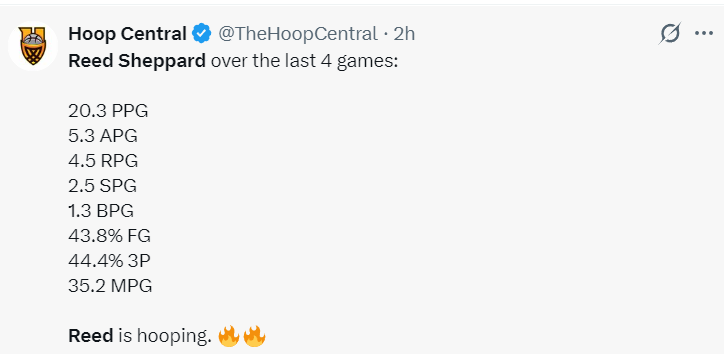 此役后谢泼德最近四场比赛,场均35.2分钟,拿到20.3分5.3助攻4.5篮板2.5抢断1.3盖帽,三分命中率44.4%,他本赛季先发的9场比赛火箭7胜2负。