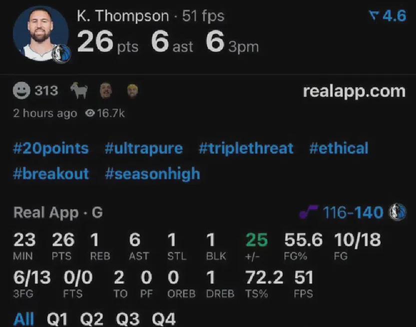 汤普森里程碑一战于独行侠144-122大胜爵士比赛,此役他投篮18中10,其中三分13中6独揽26分外加6助。